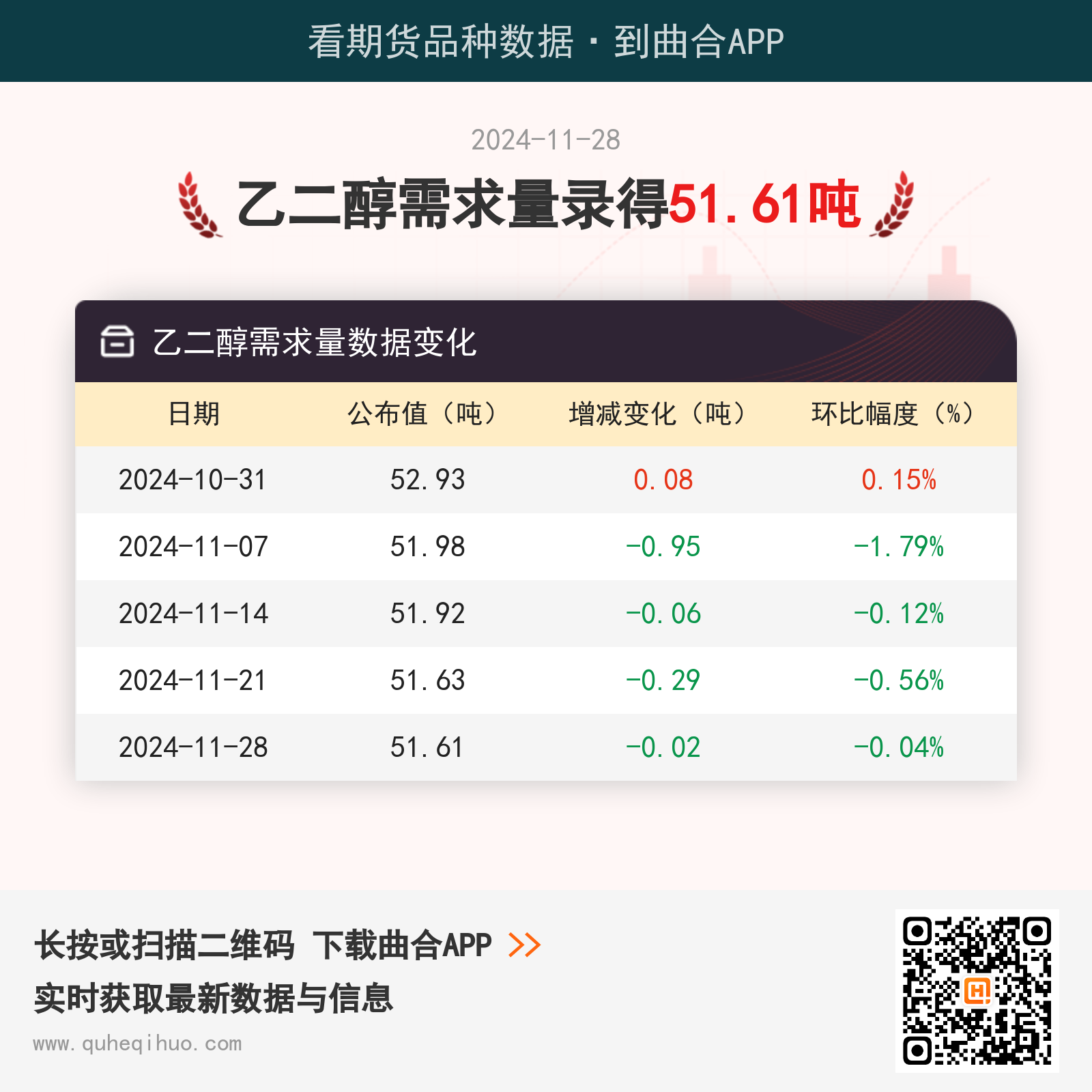 截止11月28日,乙二醇需求量数据为 51.61吨,较上一周减少0.02吨,环比跌幅0.04%。