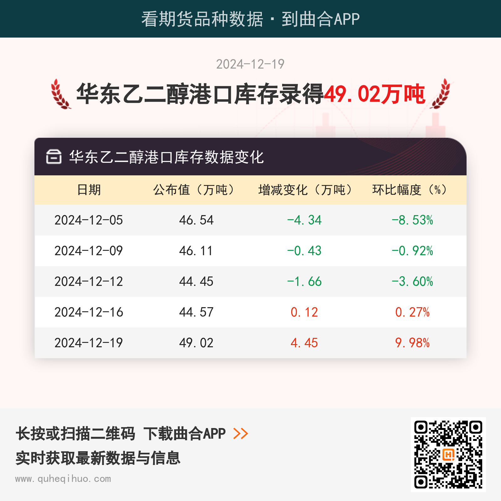 截止12月19日,华东乙二醇港口库存数据为 49.02万吨,较上一统计周期增加4.45万吨,环比涨幅9.98%。