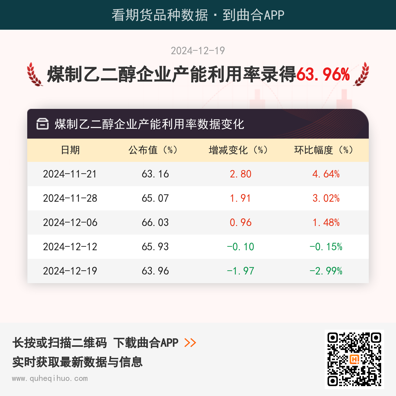 截止12月19日,煤制乙二醇企业产能利用率数据为 63.96%,较上一次减少1.97%,环比跌幅2.99%。 近期煤制乙二醇企业产能利用率数据变化如下: 图片来源于网络,如有侵权,请联系删除 乙二醇期货实时行情 更新时间:---- 最新价 -- 涨跌值 -- 涨跌幅 -- 点击查看乙二醇最新行情走势