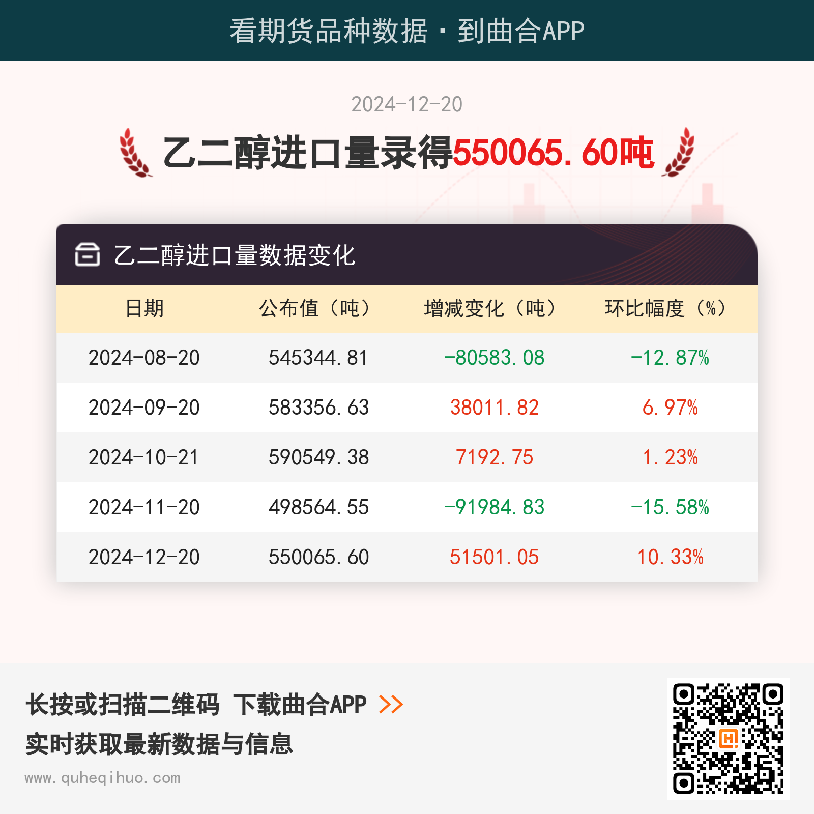 截止12月20日,乙二醇进口量数据为 550065.60吨,较上一月增加51501.05吨,环比涨幅10.33%。 近期乙二醇进口量数据变化如下:图片来源于网络,如有侵权,请联系删除 乙二醇期货实时行情 更新时间:---- 最新价 -- 涨跌值 -- 涨跌幅 -- 点击查看乙二醇最新行情走势