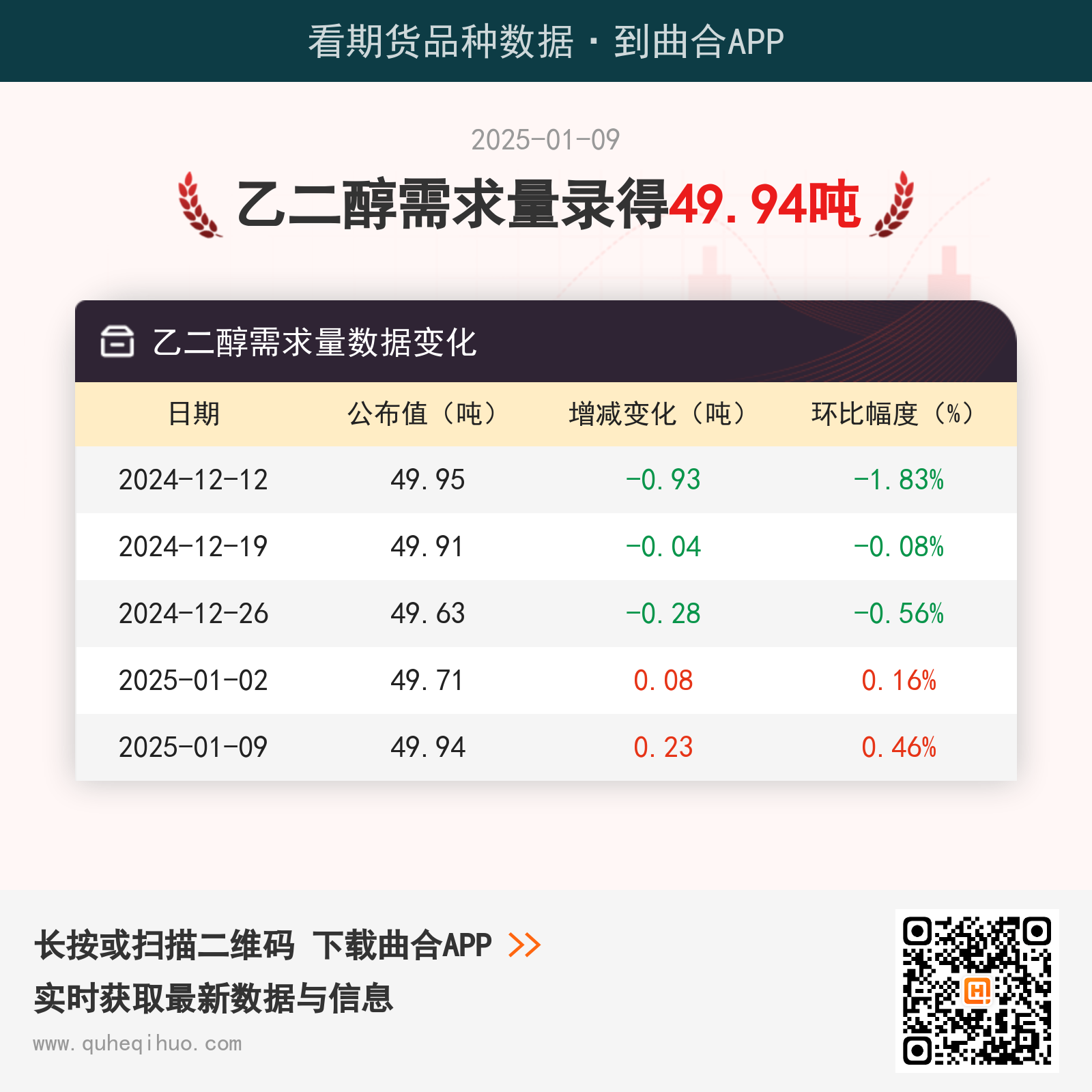 截止1月9日,乙二醇需求量数据为 49.94吨,较上一周增加0.23吨,环比涨幅0.46%。 近期乙二醇需求量数据变化如下: 图片来源于网络,如有侵权,请联系删除 乙二醇期货实时行情 更新时间:---- 最新价 -- 涨跌值 -- 涨跌幅 -- 点击查看乙二醇最新行情走势
