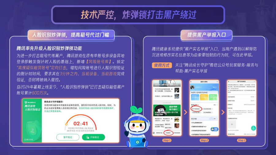 同时,为打击租号、代练等黑产团队,腾讯游戏升级了人脸识别“炸弹锁”功能并引导用户通过黑产举报入口进行实名举报。此外,官方还针对寒假时段为家长提供体系化服务,覆盖游戏管理、亲子沟通、疑问解答等多个环节。