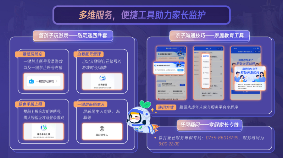 除打击黑产,腾讯游戏同样一直致力于为家长提供全方位的未成年人游戏监护服务。针对寒假这一未成年人娱乐时间激增、在职家长普遍难以实时监管的特殊时段,腾讯游戏于2025年寒假推出更为体系化的家长服务包,从游戏管理、亲子沟通和疑难解答三个主要方面提供助力。