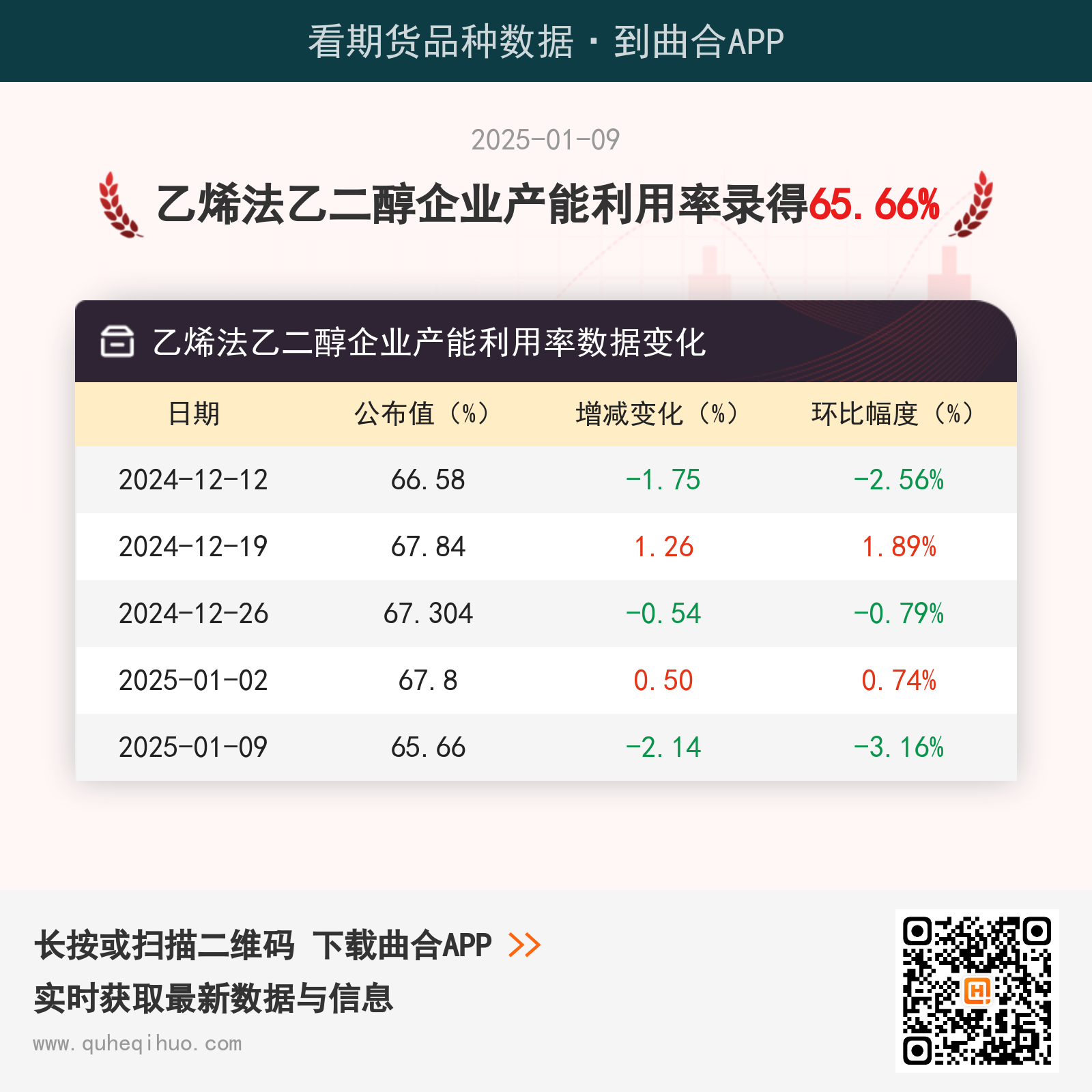 截止1月9日,乙烯法乙二醇企业产能利用率数据为 65.66%,较上一次减少2.14%,环比跌幅3.16%。 近期乙烯法乙二醇企业产能利用率数据变化如下: 图片来源于网络,如有侵权,请联系删除 乙二醇期货实时行情 更新时间:---- 最新价 -- 涨跌值 -- 涨跌幅 -- 点击查看乙二醇最新行情走势