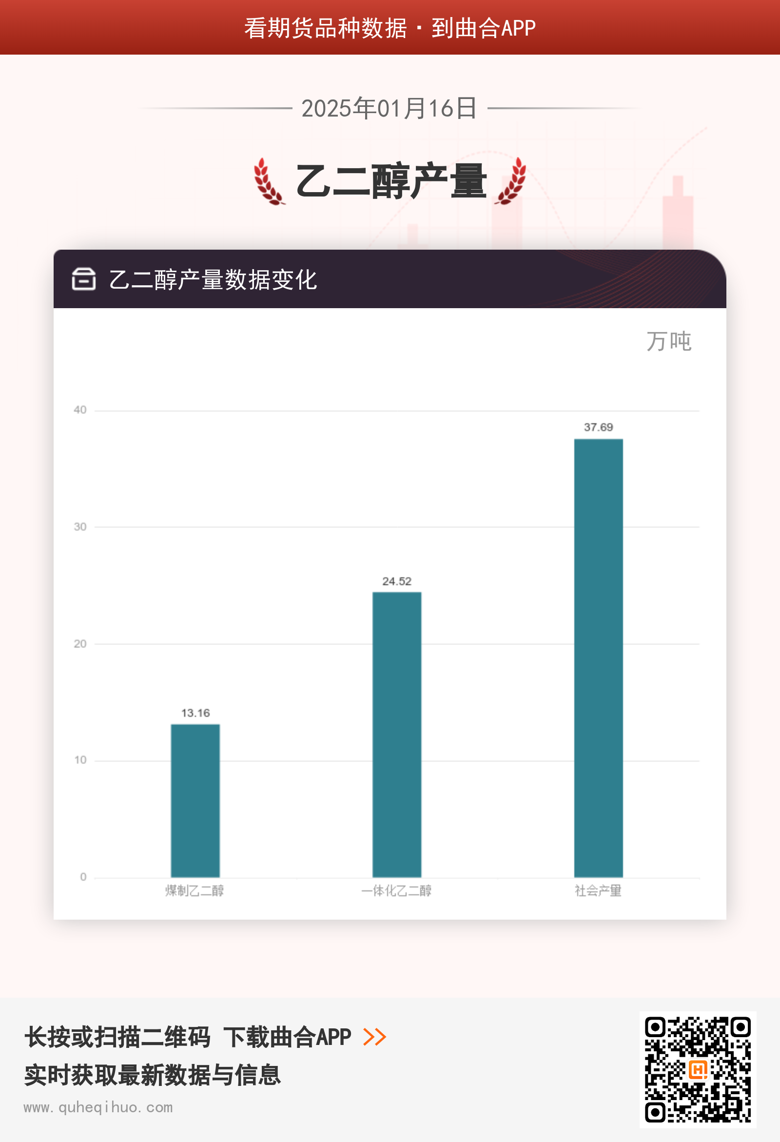 截止1月16日,煤制乙二醇产量为 13.16万吨,较上一周增加0.45万吨,环比涨幅3.54%。一体化乙二醇产量为 24.52万吨,较上一周减少0.66万吨,环比跌幅2.62%。社会产量产量为 37.69万吨,较上一周减少0.20万吨,环比跌幅0.53%。