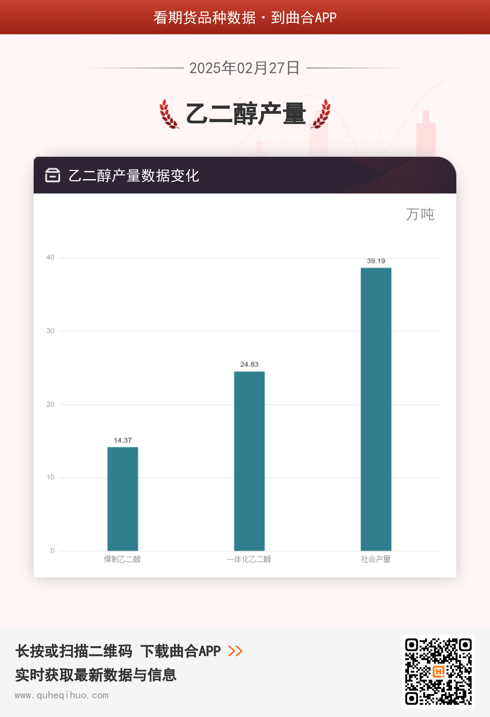 截止2月27日,煤制乙二醇产量为 14.37万吨,较上一周增加0.24万吨,环比涨幅1.70%。一体化乙二醇产量为 24.83万吨,较上一周减少1.28万吨,环比跌幅4.90%。社会产量产量为 39.19万吨,较上一周减少1.05万吨,环比跌幅2.61%。