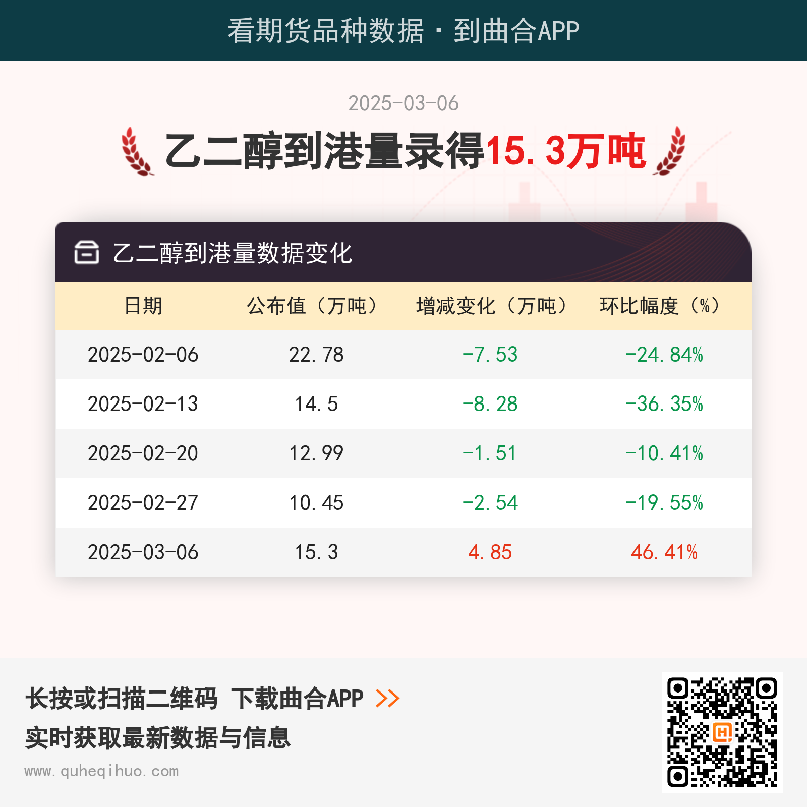 截止3月6日,乙二醇到港量数据为 15.3万吨,较上一次增加4.85万吨,环比涨幅46.41%。