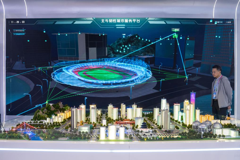 观众在了解配有北斗技术的城市安全风险综合监测预警平台。新华社记者 陈思汗 摄